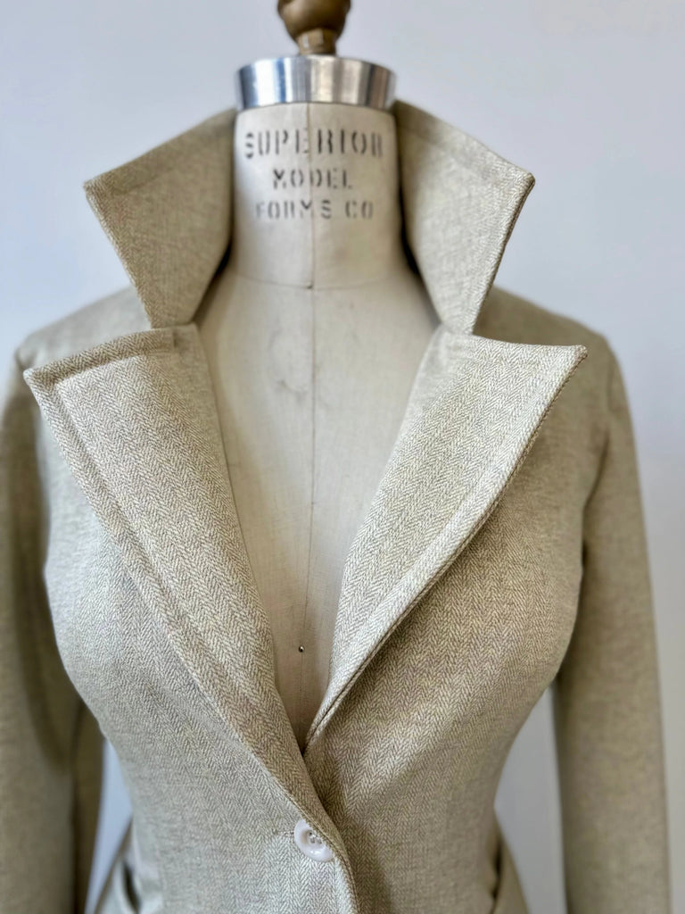 La veste Piper séduit par sa coupe courte et soignée, avec son col tailleur et ses deux poches discrètes à l’avant. Son tissu épais et doux, au chevron d’inspiration anglaise, enveloppe la silhouette avec une allure à la fois structurée et réconfortante. La dominante vanille se pare de reflets rosés et verdâtres, offrant un jeu de lumière raffiné qui illumine chaque tenue. Pièce forte et féminine, Piper conjugue élégance intemporelle et douceur lumineuse, pour un veston qui fait rayonner l’automne.