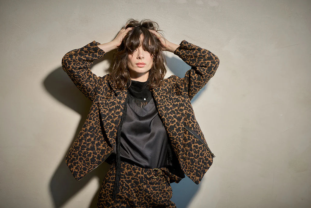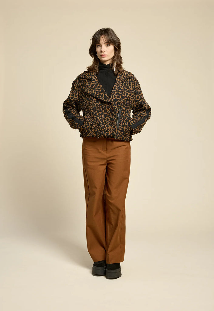 Une veste d'automne style perfecto dans un de nos tissus phare de la saison : notre jacquard à motifs léopard. Une veste courte et ample, fermée par un zip. On adore son détail de bande sur la manche. Un modèle à adopter sans plus tarder!